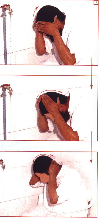 ثم يمسح رأسه مع الأذنين مرة واحدة ، ويبدأ من مقدمة رأسه ثم يذهب بيديه إلى مؤخرة رأسه ثم يعود إلى مقدمة رأسه مرة أخرى .