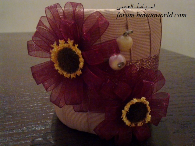 شاء الله في الصور تكون واضحه لكم الطريقه ,,, وبعد الف والدوران رجعت قفلت العلبه من تحت بالغطاء السفلي حطيت غراء مسدس على اطراف العلبه واثبت الغطاء وترجع العلبه مقفله من تحت مثل اول ويبدا الابداع في التزيين