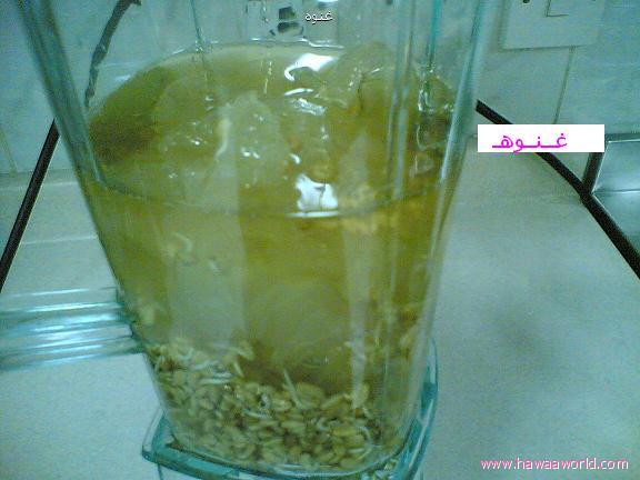 بعد كذا تجيبي ملعقة وتشيلي الحلبة والصبارة وتحطيها في وسط الخلاط وتضيفي لها زيت النارجين الكمية بالنظر وتضيفي البللة المسلوقة مع مويتها