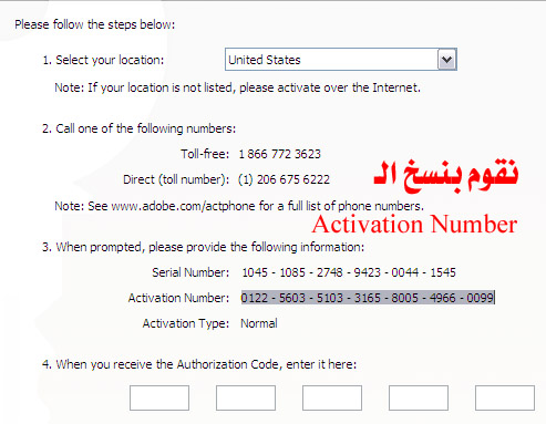 ونقوم بلصق الرقم في المستطيل رقم 2 ( Activation numer )