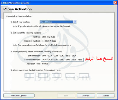 - في النهاية انسخ الرقم الاخير وضعه في مكان التفعيل كما يظهر بالصوره التالية :