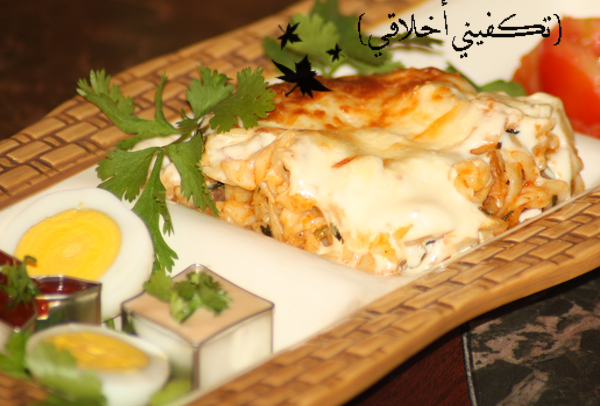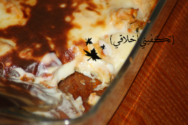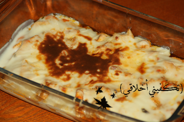 7- صبيت عليه الحليب والكريمة أو القشطة وشيت الجبن المبشور كـ آخر طبقة ::