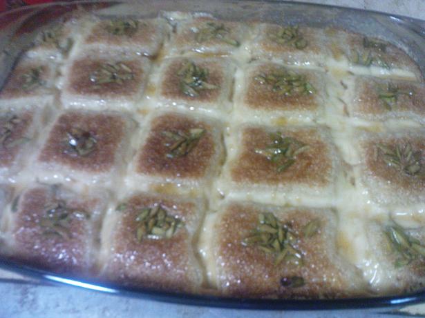 حبيت أشكر الاخت ام هياوي على وصفة البسبوسة وانا عجبتني وااايد وطبقتها ومع اضافات بسيطة من عندي سويت خطوط بالطول وبالعرض على البسبوسة بالقشطة قبل مادخلها الفرن وحطيت عليها شرايح الفستق ...