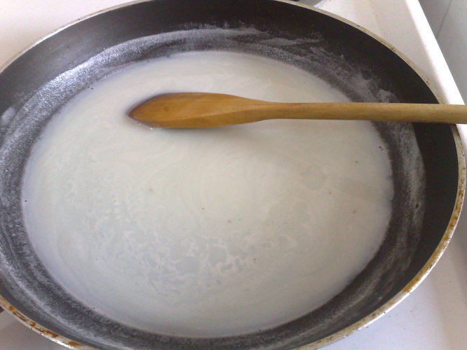 2}في قدر على النار اسكبي حليب الصويا والكورن سيرب واتركيهم الى ان يبدؤا