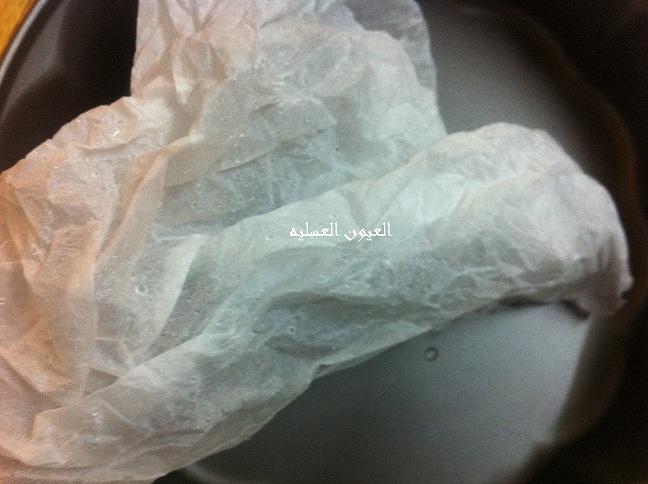 إخبزي الكاتو بأي فورم تحبيه.. بللي ورق الزبده فقط بالماء و إعصري ثم ضعيه فوق قالب الكاتو( ولا تستخدمي زبدة أو زيت على كل القوالب) مايعجزك بعد الخبز إذا بللتي الورق....
