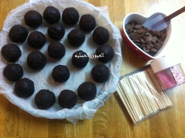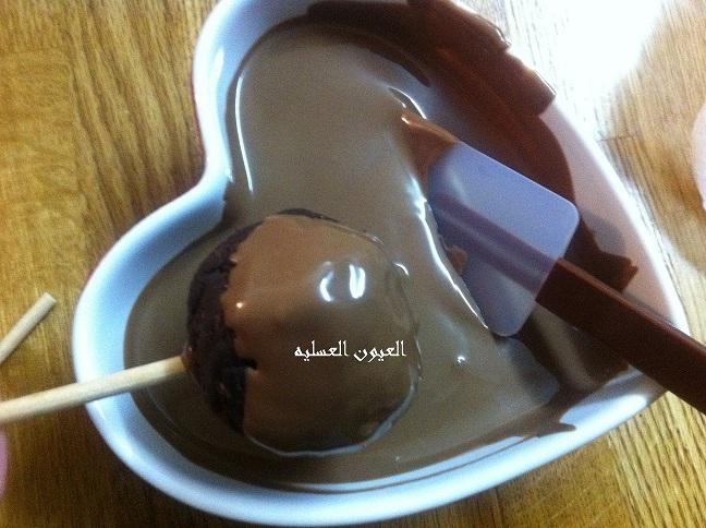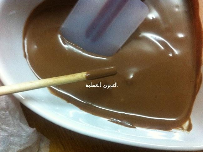 نجهز الشكولا نذوبها بالطريقة المعتاده... و نغرس البوب ستيكس بالشكولاه بعدين بـــ الكور و نخليها بالفريزر 10 دقائق لتثبت