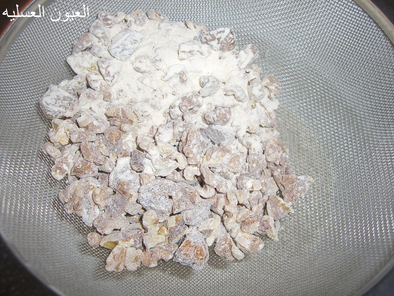 بنخلي شوي طحين على المكسرات و ننخله لحتى ما تهبط بقاع الكيكه