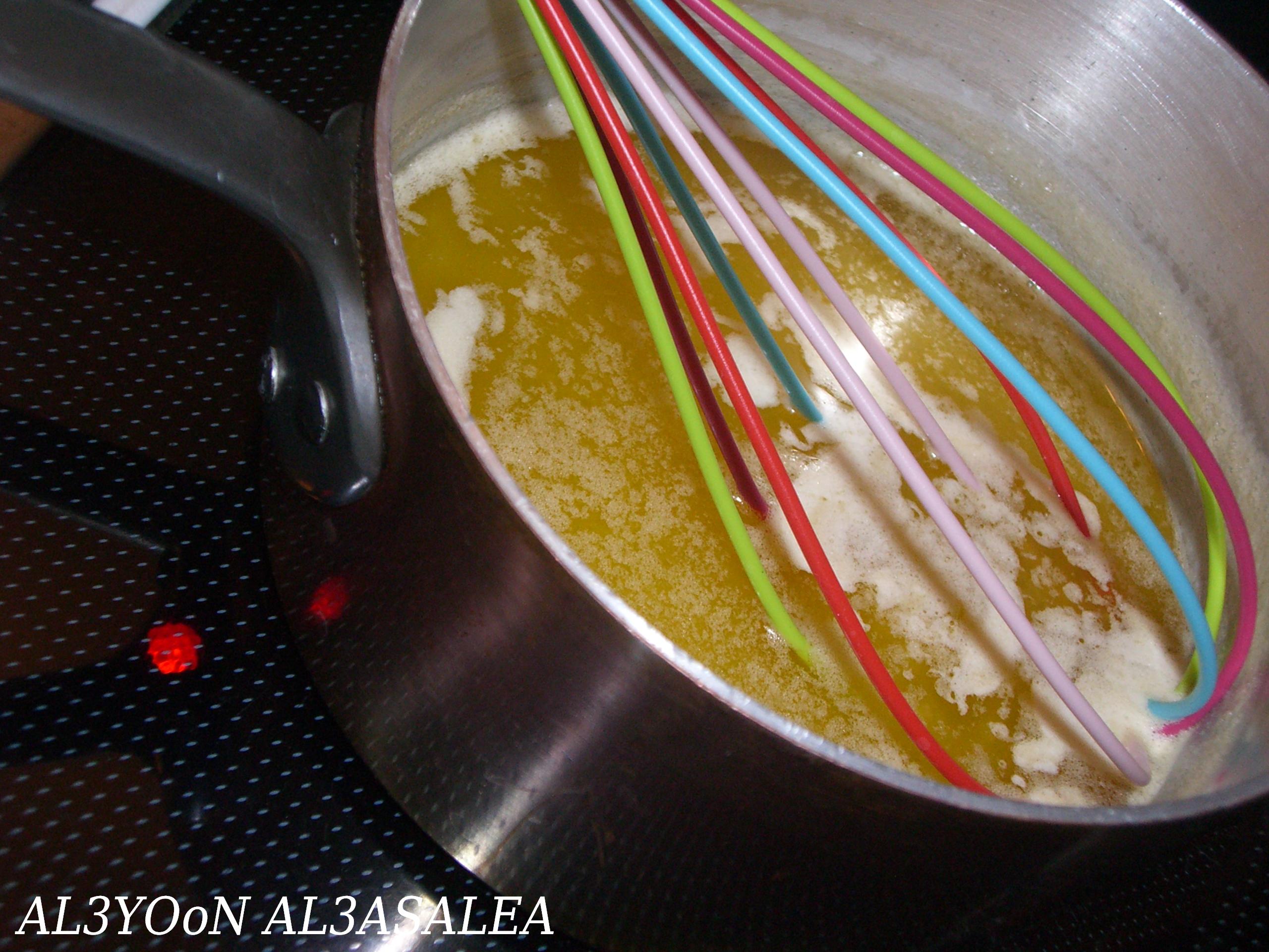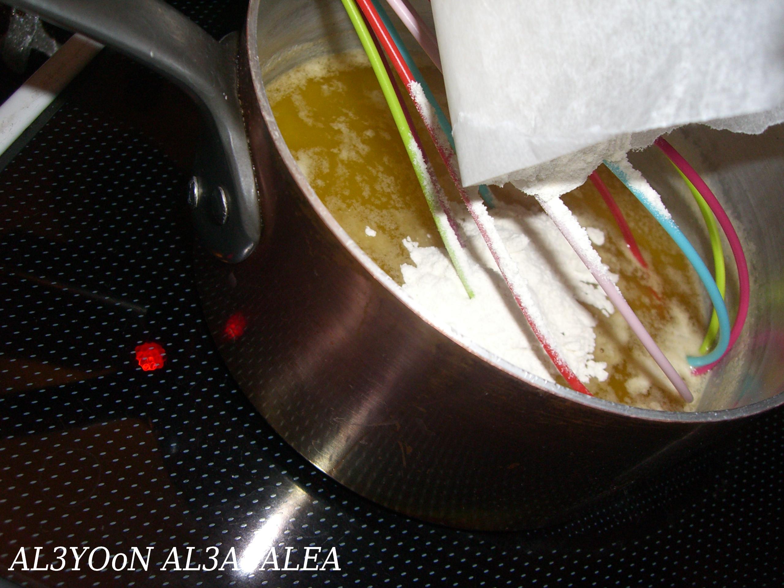 نظيف كميه الطحين على الماء و الزيده و نحرك بسرعه لين تتكون عجينه