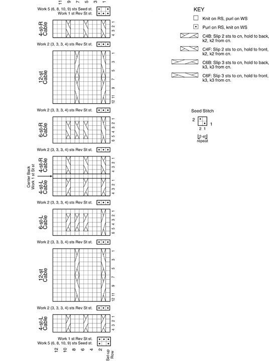 Twist to left (TL): Skip first st, knit in back of second st on left-hand needle, knit in first st and slip both sts to right-hand needle.
