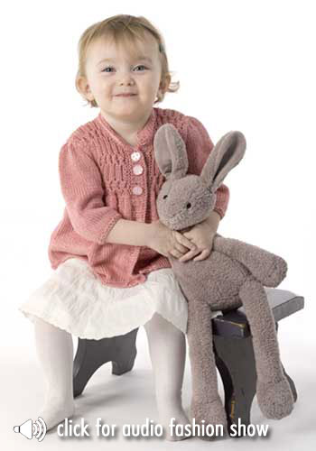Using size 6 needles, cast on 44 (48, 52) sts. Knit 4 rows. Change to size 7 needles. Work even in St stuntil piece measures 7 1/2 (9, 11)" from beginning, end with a WS row and decrease 14 (14, 14) sts evenly across last row— 30 (34, 38) sts. Begin smock pattern and work until piece measures 8 1/2 (10, 12)" from beginning, end with a WS row.