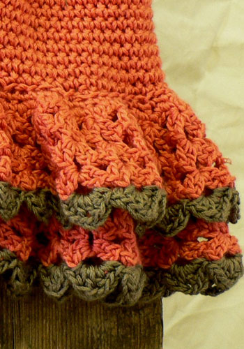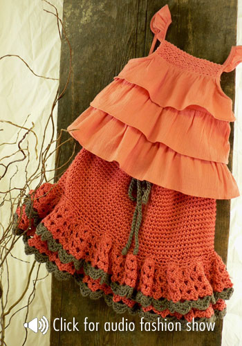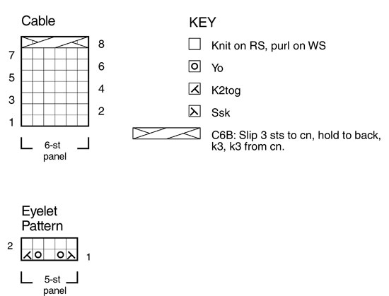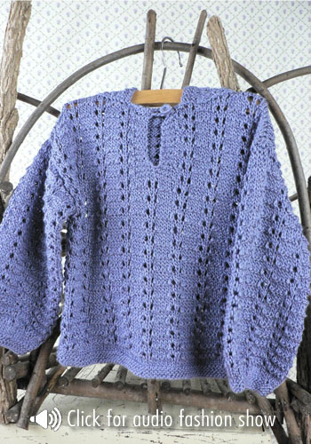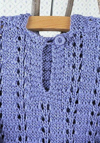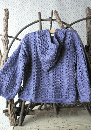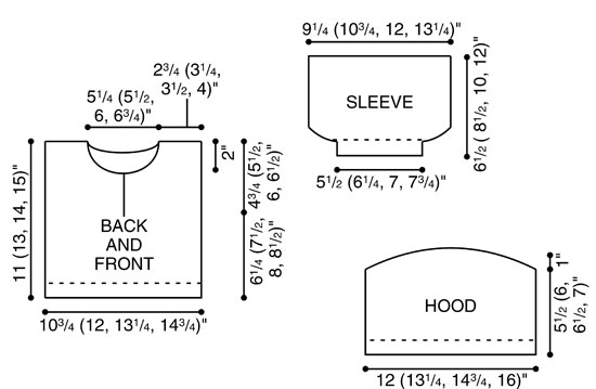(8) .. .. SIZES X-Small (Small, Medium, Large) To fit: Baby size 6-12 mo (12-18 mo, child's 2-4, 6) FINISHED MEASUREMENTS: Chest: 20 1/2 (23, 25 1/2, 28 1/2)"/52 (58.5, 65, 72) cm Length 11 (13, 14, 15)" /28 (33, 35.5, 38) cm GAUGE In Stockinette stitch, 22 sts and 30 rows = 4"/10 cm, using larger needles; in Texture patt, after blocking, 19 – 21 sts = 4"/10 cm Note: Texture pattern is very flexible; garment may be blocked larger or smaller than stated, if desired. ABBREVIATIONS k1-f/b (increase): Knit next st, then knit it through the back loop. k2tog (decrease): Knit 2 sts together through the front loops. p2tog (decrease): Purl 2 sts together through the front loops. ssk (decrease): Slip 2 sts, one at a time knitwise, to right-hand needle, return sts to left-hand needle in turned position and knit them together through the back loops. yo (increase): If last st was purl, next st is to be knit: With yarn in front (purl position), carry yarn over the needle to back, ready to knit the next stitch. If last st was knit, next st is to be purl: With yarn in back (knit position), bring it to the front between the needles, (purl position), then carry it over the needle, and between needles to front once more, ready to purl the next stitch. KNIT STITCHES USED Garter stitch: Knit all sts every row. Stockinette stitch (St st): Knit on RS, purl on WS. Texture Pattern (multiple of 7 sts) Row 1 (RS): * P1, p2tog, yo, k1, yo, p2tog, p1; repeat from * across. Row 2: Purl. Row 3: Knit. Row 4: Purl. Repeat Rows 1 – 4 for Texture patt. CROCHET STITCHES USED Chain (ch): Begin by joining yarn with a slip st to edge of garment. * Wrap the yarn around the hook (yarn over) and pull up a loop, [draw the yarn through the loop on the hook to form the first chain]. Repeat from * for length desired. NOTE Blocking is very important after completing pieces; lay flat and spray with warm water; pin to measurements and allow to air dry. HOOD Using larger needles, cast on 60 (66, 72, 79) sts. (RS) Begin Garter st; work even for 6 rows, end with a WS row. (RS) Knit, inc 3 (4, 5, 5) sts evenly across by k1-f/b—63 (70, 77, 84) sts. (WS) Purl 1 row. (RS) Begin Texture patt; work even until piece measures 5 1/2 (6, 6 1/2, 7)", end with (RS) Row 1 of patt. Shape Hood (WS) Bind off 8 (9, 10, 11) sts at beg of next 6 rows—15 (16, 17, 18) sts remain. (WS) Bind off 8 (8, 9, 9) sts at beg of next row, bind off rem sts. BACK Using larger needles, cast on 56 (63, 70, 77) sts. (RS) Begin Garter st; work even for 6 rows, end with a WS row. (RS) Begin St st; work even for 2 rows, end with a WS row. (RS) Begin Texture patt; work even until piece measures 10 1/2 (12 1/2, 13 1/2, 14 1/2)" from beginning, end with a WS row; pm each side of center 26 (27, 30, 33) sts for back neck. Shape Neck (RS) Continue in patt, work across to 2 sts before first marker, k2tog, remove marker, turn, leaving remaining sts unworked—14 (17, 19, 21) sts for right shoulder. (WS) Purl. Bind off shoulder sts. With RS facing, join yarn at neck edge, bind off neck sts, ssk, work to end in patt—14 (17, 19, 21) sts remain for left shoulder. (WS) Purl. Bind off shoulder sts. FRONT Work as for Back until piece measures 6 1/2 (8 1/2, 9 1/2, 10 1/2)" from beginning, end with (WS) Row 2 of patt; pm each side of center 8 (9, 8, 9) sts. Establish Placket (RS) Continue in patt, work across to first marker; slip marker, k8 (9, 8, 9) for placket (keep in Garter st), slip marker; work in patt to end. Continue as established, working sts between markers in Garter st, remaining sts in patt, for 5 rows, end with a WS row. Shape Neck Opening (RS) Work across to marker; slip marker, k4; join a second ball of yarn, k0 (k2tog, 0, k2tog), k4 (3, 4, 3), work in patt to end—4 sts each side of neck opening in Garter st; 28 (31, 35, 38) sts total each side of opening. Working both side at same time, continue as established, work even until piece measures 9 (11, 12, 13)" from beginning, end with a WS row. At each neck edge, bind off 6 (6, 6, 7) sts once, then 4 (4, 5, 5) sts twice—14 (17, 19, 21) sts remain each side for shoulders. Work even until piece measures same as Back to shoulder. Bind off remaining sts. SLEEVES Using smaller needles, cast on 31 (35, 39, 43) sts. (RS) Begin Garter st; work even for 6 rows, end with a WS row. Change to larger needles and St st. (RS) Beginning this row,inc 6 (7, 8, 9) sts evenly across every other row 3 times, end with a WS row—49 (56, 63, 70) sts. (RS) Begin Texture patt; work even until piece measures 6 1/2 (8 1/2, 10, 12)" from beginning, or desired length to underarm, end with WS row. Bind off all sts loosely in patt. FINISHING Block pieces to measurements. Measure down approx 4 3/4 (5 1/2, 6, 6 1/2)" from shoulder each side, Back and Front. Sew shoulder seams. Sew sleeves between markers; sew sleeve and side seams. Sew Hood around neck shaping, stopping 1" each side of Placket on Fronts, easing to fit (see photo). Button loop Using crochet hook, join yarn with a slip st to right Front Placket edge; chain 15, or length to fit button, join with a slip st to same st at Placket edge. Sew button on left Front, opposite button loop. Using yarn needle, weave in all ends.(8) .. .. SIZES X-Small (Small, Medium, Large) To fit: Baby size 6-12 mo...