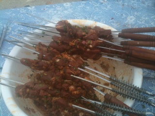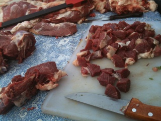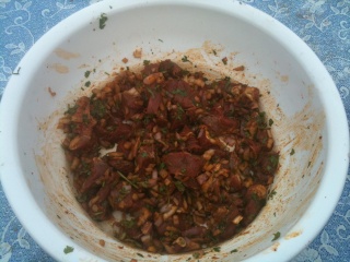 قمت بشرملة قطع اللحم بالبصل والقزبر والتوابل