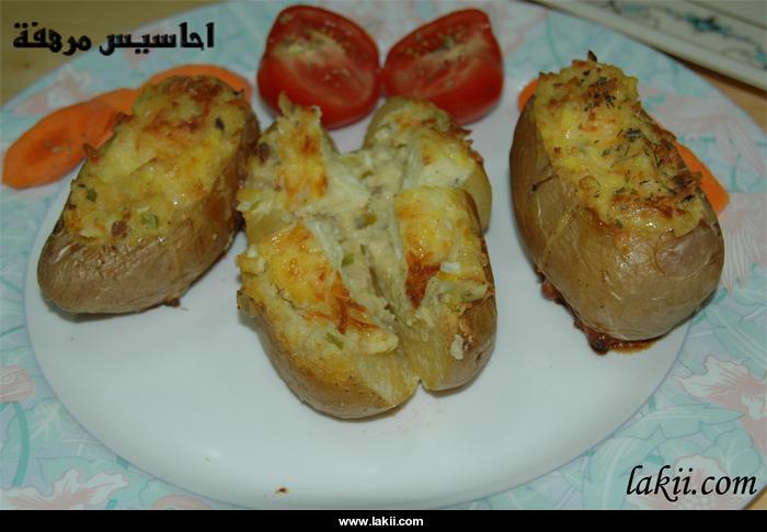 إللي فهمته إنه بطاطس عـآآدي .. خذي البطاطس وإغسليهـآ ثم إفتحيه من النص بس إنتبهي لآ تنقطع ! بس إفتحيهـآآ بس لآ يوصل للآخر .. ودخليهـآ الفرن 30 دقيقة وإذآ نضجت حطي عليهـآ جبن موزريلاأو جبن شرآيح أي نوع تفضلين وبالعآفيـة :)