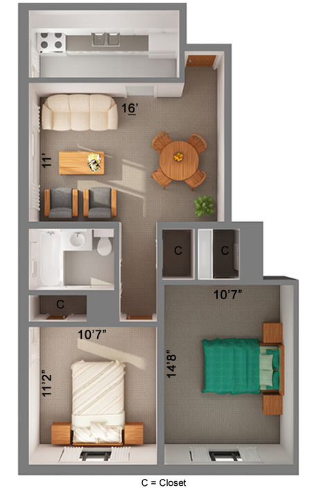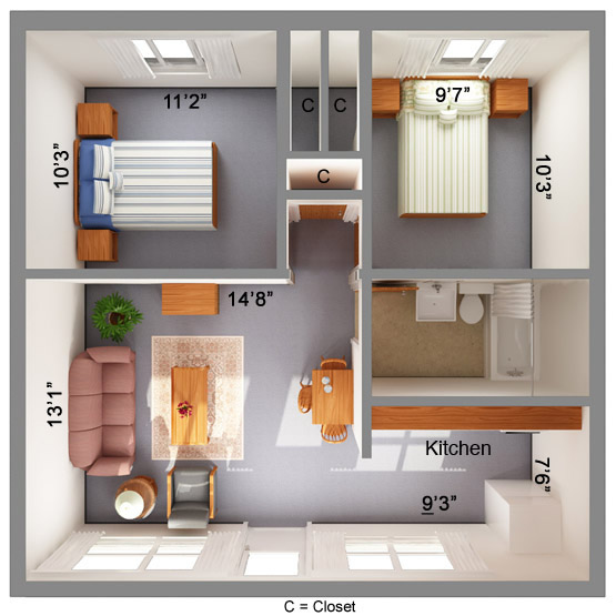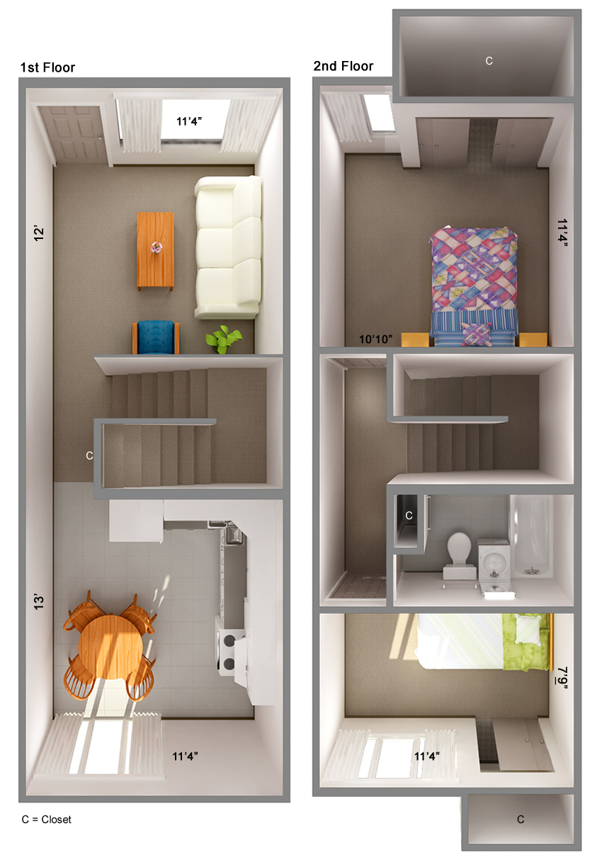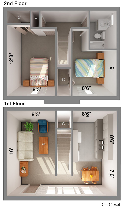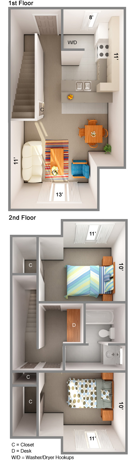 University Village 1700 2 Bedroom Floor Plan - Townhouse Style