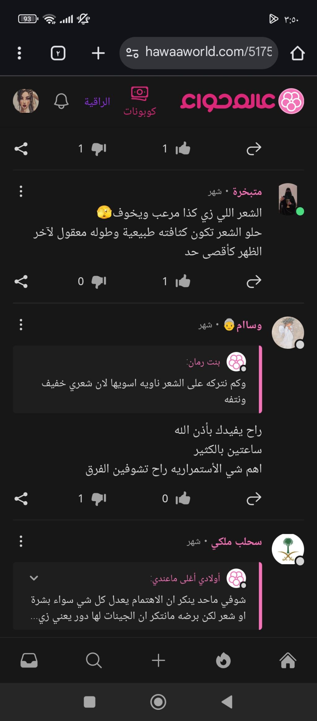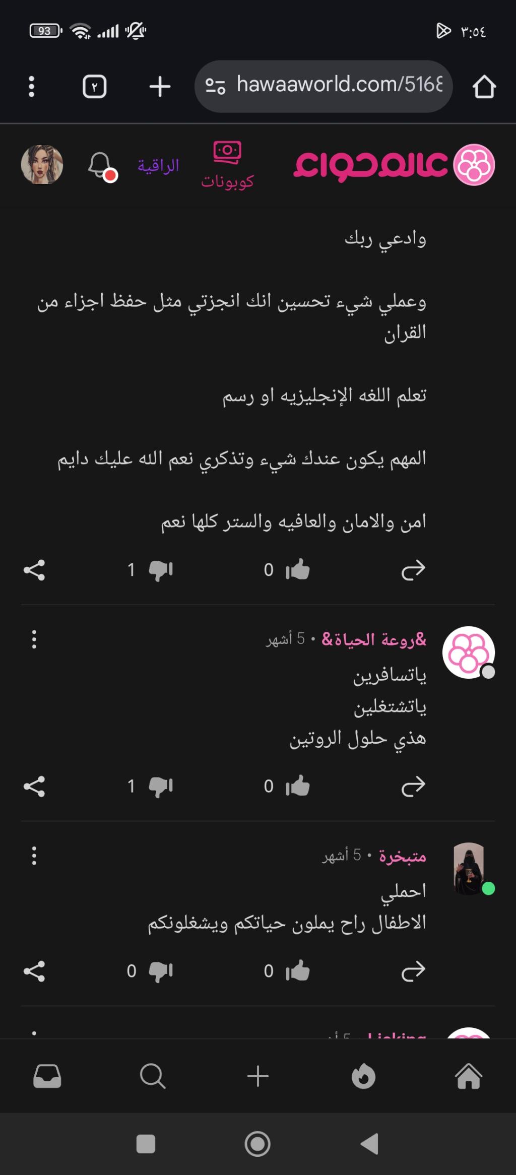 السلام عليكم ياخواتي احب عالم حواء لاني احس اني بين اهلي وناسي وحافظ اسراري ❤️ انا بنت عمري ٢٤ وكأي بنت كبرت اقلق بموضوع الزواج والنصييب رغم انه بدري على هذا التفكير  ابي اعف نفسي عن الحرام واتزوج بهالعمر عشان اقدر اكون اسرة واستمتع... المزيد