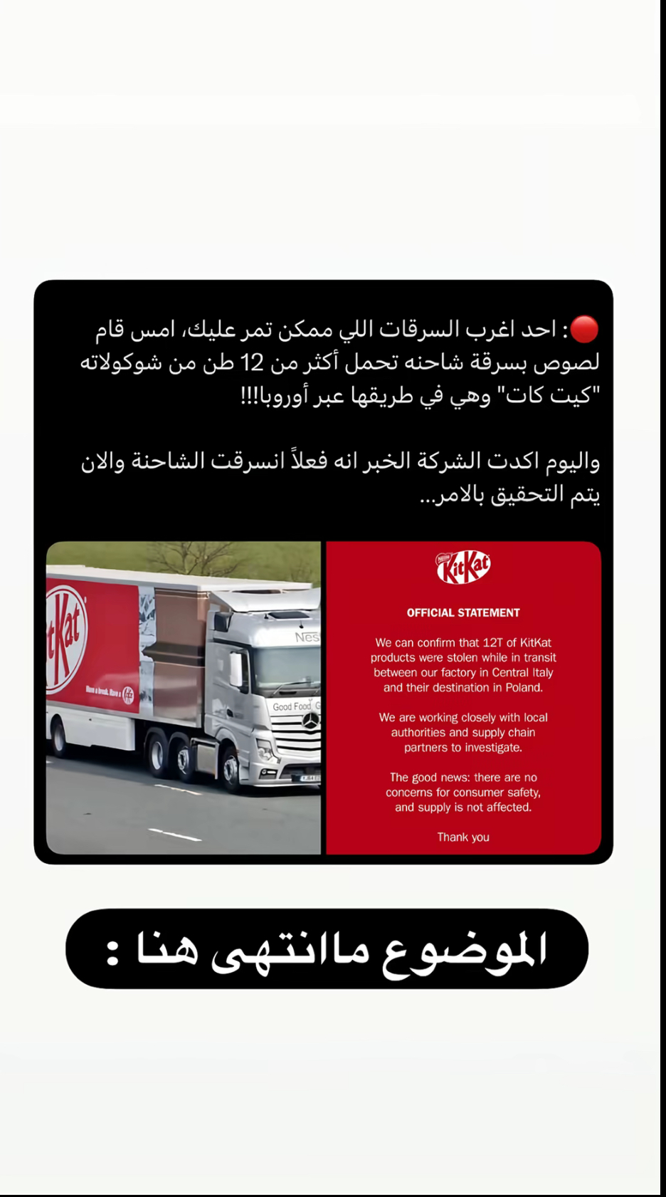 تدرون بعد هذي السرقه قام سوق الكتكات؟وكل الكوفيهات والمطاعم صارت تقدم الكتكات مع طلبات الزباين🍫..على طول جا ببالي ( ربة ضرةً نافعه) وعسى ان تكرهو شيأ وهو خيرٌ لكم …مين كان يتوقع ان بعد هالسرقه راح يقوم سوق كتكات🤣..سبحان الله