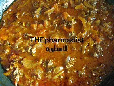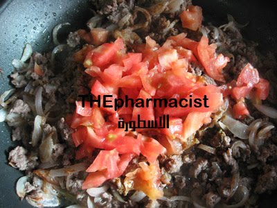 ثم نضيف اللحمة المفرومة والبهارات ونقلبها جيداا
