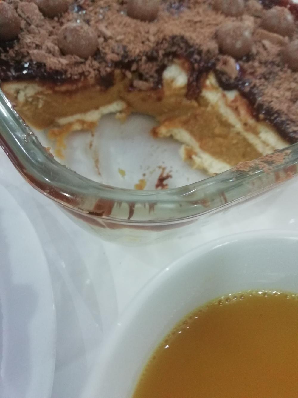 الطبقة الاولى بسكويت شاي مغمس بحليب سوي كم طبقة براحتك اهم شيء فوق طبقتين الطبقة الثانية (ظرفين كريم كراميل +ملعقتين قشطة +كاسين حليب على النار الين تفور خذي خلاط الكااااس تمام حطي فية الخليط وعليهم 7حبات بسكويت شاي 4اصابع جالكسي اي نوع تفضلينه وملعقة صغيرة جدا نسكافيه واضربيهم