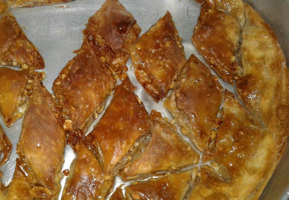 تعجني العجينه مع شوي مويه وتكون لا رطبه ولا قاسيه وتخليها ع جنب تغطيها وبعد عشرين دقيقه قطعيها كور يعني لازم يكونوا 15 كره وما فوق .وغطيهم خليهم عشر دقايق بعد كذه تبداي كذه تسطحي الكره شويه بيدك وتخليها دقيقتين بعدين تمديها ع شكل دايره كبيره وتجيبي صحن دايري مدهون بزيت ورشه دقيق وحطوا الطبقه الأولى ورشوها بزيت ومدوا طبقه ثانيه وثالثه وما بين كل طبقه وطبقه رشوا زيت بعدما مديتي الطبقه الثالثه رشيها فول سوداني مكسر مو مطحون . تكسريه تكسير ولازم يكون محمص أنا نسيت احمصه المهم ترشيه فول سوداني ورشه قرفه مطحونه وتسوي بعدين ثلاث طبقات وبعدين ترشي الفول السوداني وهكذا تستمري واخر طبقتين لاتسوي فيهم شي صورت لكم الخطوات