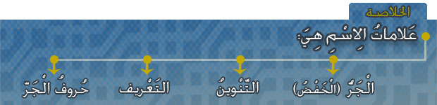 الخفض (الجر ) وهي الكسرة أو ما ينوب عنها في علامات الإعراب مثال : ( مررتُ بغلامِ محمدٍ الأمينِ ) فالأسماء في هذه الجملة هي غلام لقبولها الكسرة لأنها اسم مجرورة وكلمة محمد أيضا لأنها مجرورة بالإضافةوكلمة الأمين لأنها صفة لاسم مجرورومثال ما ينوب عن الكسرة مثلا (مررت بالمعلمين ) فكلمة معلمين جمع مذكر سالم علامة جره الياء نيابة عن الكسرة