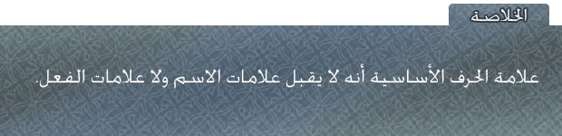 الْحَرْفُ لَيْسَتْ لَه عَلاماتٌ مُسْتَقِلَّةٌ، فَعَلامَتُهُ الْأَسَاسِيَّةُ أَنَّهُ لَا يَقْبَلُ عَلَامَاتِ الِاسْمِ وَلَا عَلَامَاتِ الْفِعْلِ. فَإِذَا عَرَضْتَ عَلَى كَلِمَةٍ عَلَاماتِ الاِسْمِ وَعَلَاماتِ الْفِعْلِ فَلَمْ تَقْبَلْها فَمَعْنَى ذَلِكَ أَنَّهَا حَرْفٌ.